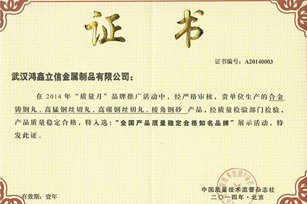 武漢鴻鑫立信金屬制品有限公司主要從事鋼丸、鋼絲切丸、鋼砂等除銹防腐耗材的生產(chǎn)和銷售。公司所有產(chǎn)品均通過ISO9001**質(zhì)量認證,2014年更獲得了第三屆中國金屬磨料行業(yè)具有影響力品牌-華尊獎。董事長陳群芝女士從事行業(yè)17年來專注為客戶節(jié)約鋼丸消耗成本,2014年獲得了華尊獎-中國品牌建設(shè)實踐百名創(chuàng)新很好企業(yè)家的榮譽。服務(wù)過的國家建設(shè)項目有:北京鳥巢體育館、遼寧號航母、杭州灣跨海大橋、南海軍艦、成都雙流**機場、南車集團動車檢測中心、武漢火車站、武漢天興洲大橋等,同時服務(wù)的行業(yè)囊括橋梁制造、船舶制造、汽車制造、火車車輛制造、大理石打磨、鑄件清砂、各種機械制造表面清理等。鴻鑫鋼丸,值得信賴。